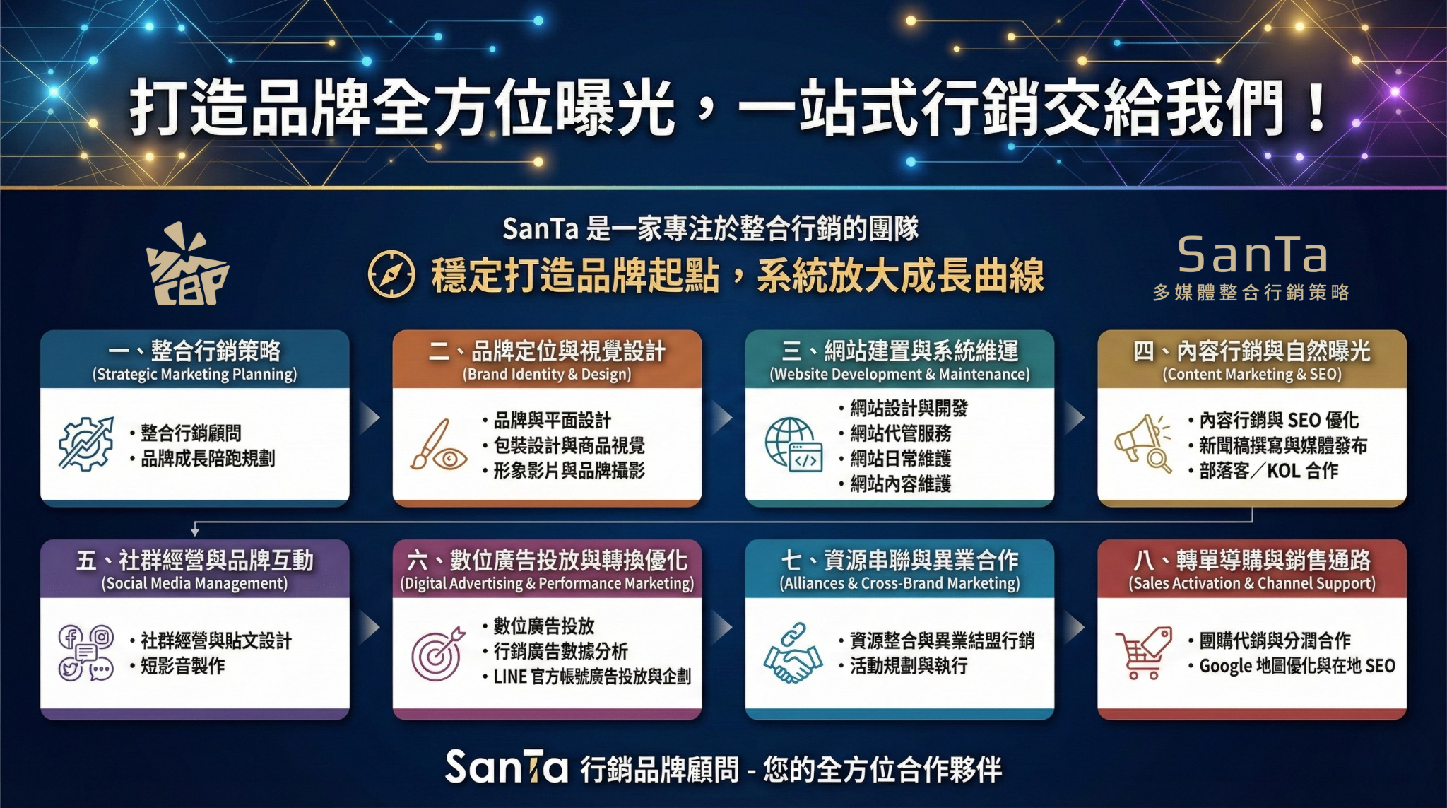 無論客戶是剛起步的新創品牌,還是轉型中的中小企業,甚至是具規模的企業內部行銷部門,SanTa 都能提供量身打造的整合行銷方案。