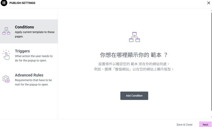 完成設計點擊發布後,會出現顯示條件及觸發條件等重要設定,儲存後就完成啦